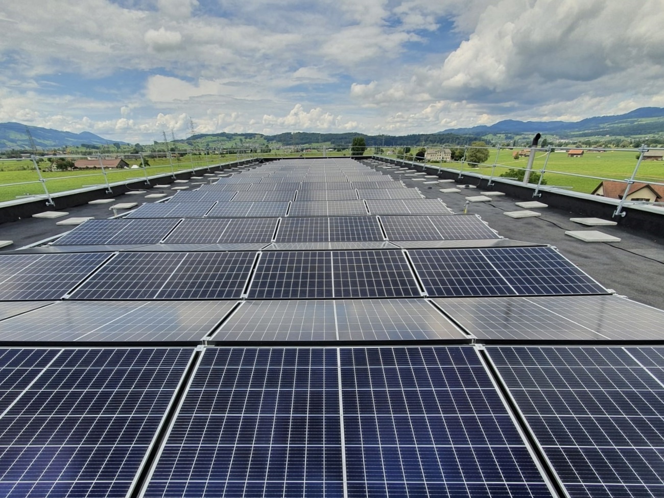 Bei Flachdachanlagen wird die Photovoltaikanlage auf dem Flachdach aufgeständert montiert. Standardmässig wird dies heute in einer Ost-West Aufständerung ausgeführt mit einer Neigung von ca. 10°. Die Montage der Anlage erfolgt dabei ohne direkte Befestigung an der Dachhaut. Um den statischen Anforderungen am Ort der Aufstellung gerecht zu werden, wird anhand einer statischen Berechnung die Anlage mit Betonsteinen und bzw. mit Kies beschwert, was zu einer erhöhten Dachbelastung führt. Diese zusätzliche Auflast ist bauseitig zu prüfen (Architekt, Statiker).